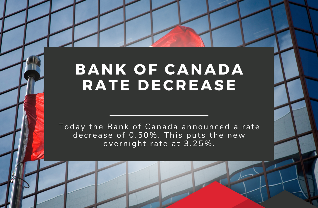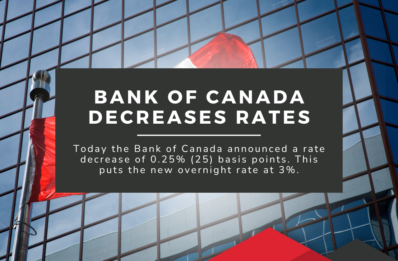 Today the Bank of Canada announced a rate decrease of 0.25% (25) basis points. This puts the new overnight rate at 3%.